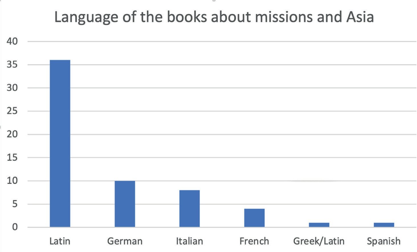 Most of the books, predictably, were written in Latin (sixty percent). The second group was written in German (seventeen percent), not very far from those written in Italian (thirteen percent). Several books were in French (seven percent), a few in Spanish and Greek/Latin (two percent each), but there are no traces of Portuguese books concerning the East Asian missions. This last finding is a further indication that few Germans left for the overseas missions, given that most of them were under the control of the Portuguese Padroado, which would have required traveling on Portuguese ships, and a considerable number of books focused on Portugal’s discoveries in East Asia were published in Portuguese.