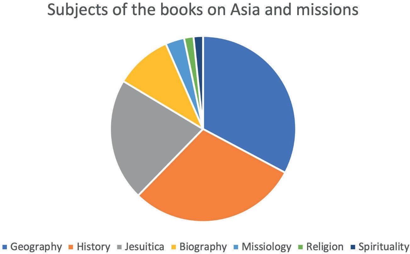 The books on the missions and on Asian civilizations covered different topics, which this graphic groups under a few main areas: