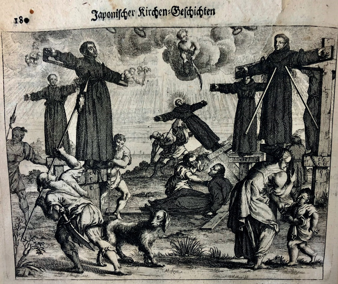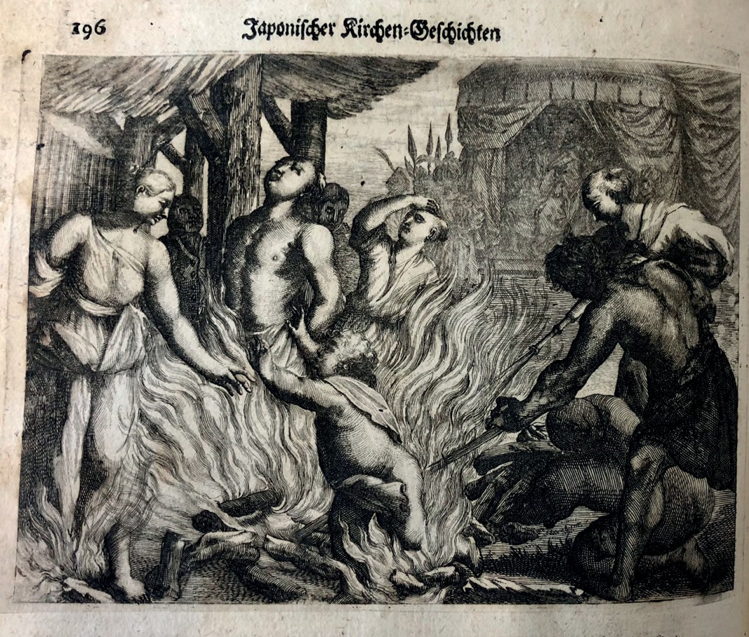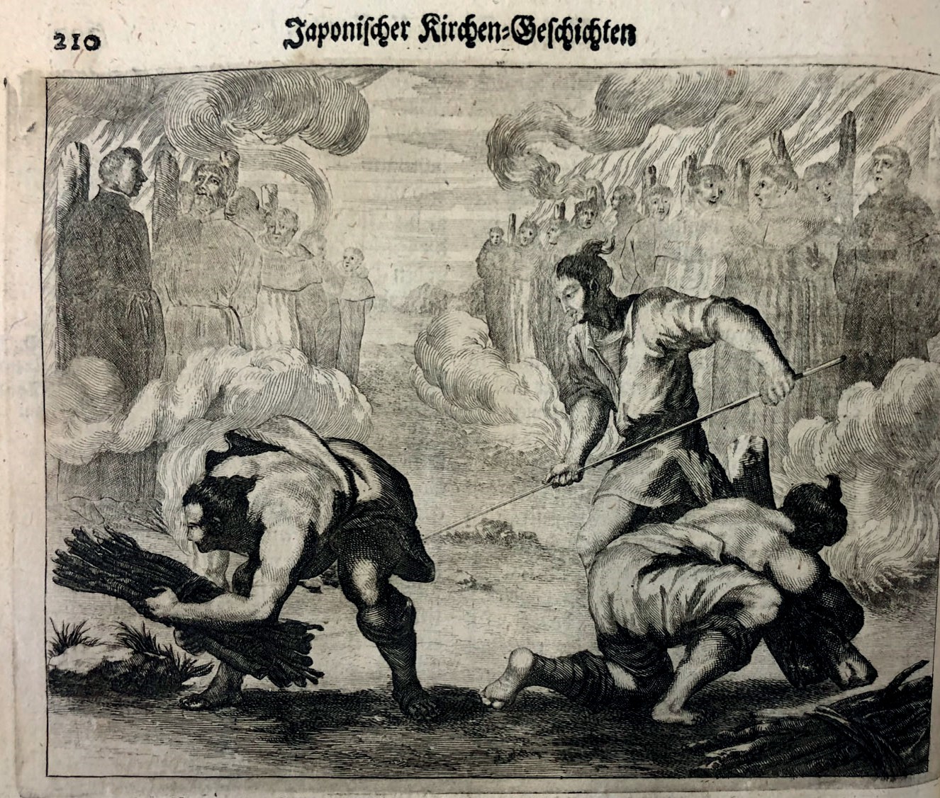 The present research tried to identify books related to travels, specifically in the East. Asia and martyrdom emerged as an inseparable combination, as shown in titles like De Christianis apud Iaponios triumphis sive de gravissima ibidem contra Christi fidem persecutione (Of the triumphs of the Christians among the Japanese, or of the most severe persecution there against the Christian faith [Munich: Sadeler, 1623]) by the Flemish procurator of the vice-province of China Nicolas Trigault (1577–1628) and De rebus Iaponicis historica relatio (A historical account of what happened in Japan) by the Portuguese Luís Froís (1532–97), one of the first Jesuits operating in Japan. Some of the sections of the latter book are especially relevant: the first one describes De gloriosa morte 26. crucifixorum, that is, it focuses on the martyrs of Nagasaki in 1597; while the third part informs the reader about De rebus per Iaponiam anno 1596 a Patris Societatis Iesu durante persecutione gestis, or the story of the persecutions suffered by the Jesuits from the first anti-Christian decrees issued by the Japanese authorities at the turn of the sixteenth century. The Flemish Cornelius Hazart (1617–90) is the author of Die Asiatische Länder: Japon, China, Tartaria, Mogor, und Bisnagar (The Asiatic countries: Japan, China, Tartaria, Mogor, and Bisnagar [Vienna: Voigt, 1678]). The books contain dozens of images representing the most horrific tortures, confirming once again how the Asian continent was inextricably intertwined with the idea of martyrdom—especially in the case of Japan, one of the destinations young Jesuits from all over Europe most longed for.