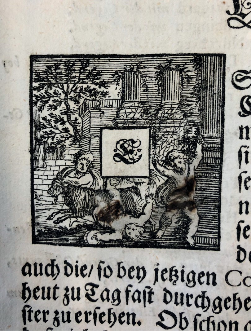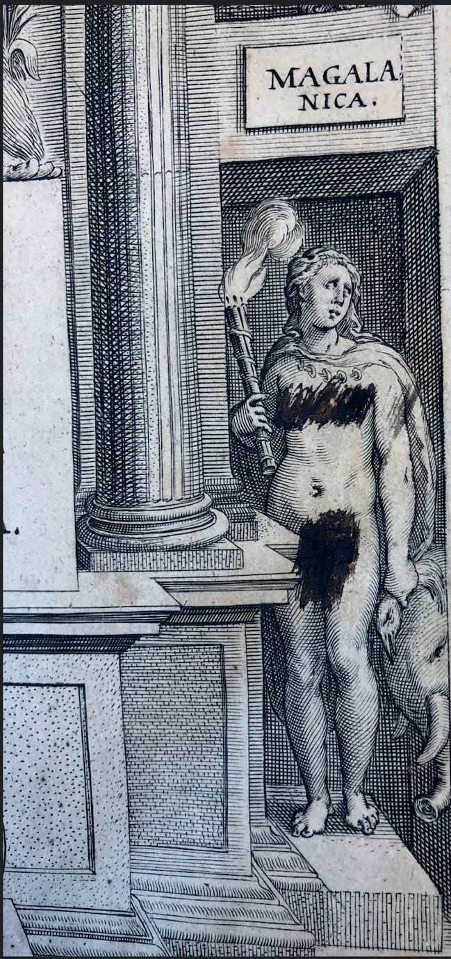 The first type of annotation consists of censures made by chaste readers, who used to put pants on depictions of naked angels or women.[37] You see above the frontispiece of one of the many atlases by Gerard Mercator (1512–94) (Atlas sive Cosmographicae meditationes de fabrica mundi et fabricati figura [Atlas or cosmographical meditations: On the creation and form of the world (Amsterdam, 1613)]). All the continents are represented by naked women, but only the last one was covered. Similarly, in Gabriel Bodenehr’s (1673–1765) Atlas Curieux oder Neuer und Compendieuser Atlas in welchem ausser den General Land Charten von America, Africa, Asia und Europa, und der in letzteren Kriegen renommiert worden, enthalten sind (Curious atlas, or new and summarized atlas, which contains the general maps of America, Africa, Asia, and Europe, and of the territories renamed after the last wars [Augsburg: Bodenehr, 1720]), there is a group of children playing together, and the reader has made sure that their nakedness is properly covered.