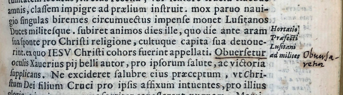 That some books were thoroughly read is suggested by the corrections made by knowledgeable readers. The best example of this kind of meticulous revision is found in an edition of Orazio Torsellino’s (1545–99) De vita Francisci Xaverii qui primus e Societate Iesu in Indiam & Iaponiam Evangelium inuexit, libri sex (Six books on the life of Francis Xavier, who was the first Jesuit to bring the Gospel to India and Japan [Rome: Zanetti, 1596]). As with today’s books, it was practically impossible to eliminate all typos, and readers could not help but notice them. On page 123, the philological reader underlined an “obversetur” and substituted it with an “obversaretur.”[38] The rest of the passage is written in the imperfect subjunctive, as in reported speech, so the change is correct.