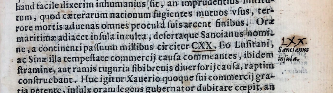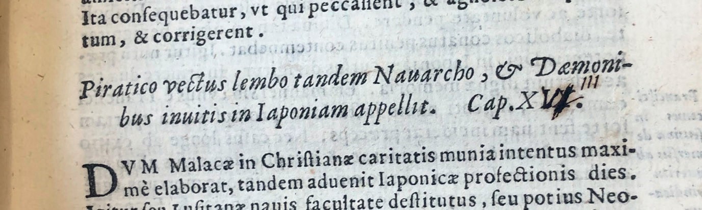 Finally, there was a third type of correction made by readers that revealed the attention and care taken when reading the content, almost as if they were professional copyeditors. One meticulous reader, for example, corrected the number of a chapter of the third book “Piratico Vectus lembo tandem Navarcho, & Daemonibus invitis in Iaponiam appellit” (Sailing on a pirate ship, Xavier finally lands in Japan, though the captain and the devils were in opposition) from “XVI” to “XVIII.” Was he right? Yes, because in consulting other versions of Torsellino’s life of Xavier, we see that this book[39] does not include a chapter 19 and finishes with this very section.