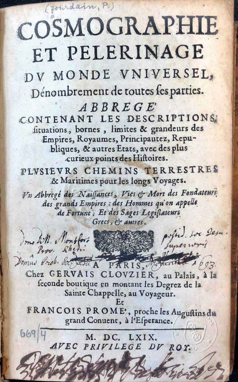 Finally, all of these books had ex libris, stamps or handwritten notes mentioning their provenance and history—which were sometimes long and tortuous. These inscriptions could be very well written and clear, like this one in the Chartae geographicae: Ex liberali donatione Nobilis & Consultissimi Domini, Domini Joannis […] Domûs Probationis Societatis IESU Moguntiae (Geographical maps: Generously donated by the noble Lord Johannes Braun […] to the probation house of the Society of Jesus in Mainz). But their provenance could include many changes of ownership, and traces of this trail of custody can be much more difficult to read. The library’s edition of P. Jourdain’s Cosmographie et pèlerinage du monde universel (Cosmography and pilgrimage of the universal world [Paris: Clovzier et Prome, 1669])[40] shows many owners in sequence, with the more recent ones canceling the traces of the previous ones and almost filling up the frontispiece.