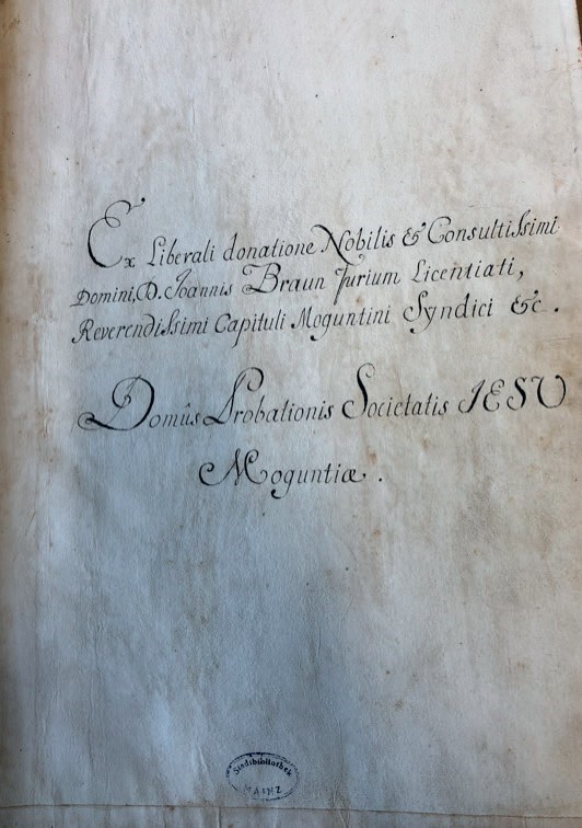 In 1773, the Society of Jesus was officially suppressed by the papal brief Dominus ac Redemptor, and all the Jesuit structures in Mainz were transferred to the city’s authorities. Among the most concrete traces Jesuits left were their libraries, as their books were prized by many.[33] Jesuits had played a vital role in education and science in the city from the second half of the sixteenth until the end of the eighteenth century. Most of the city’s jurists, philosophers, historians, and scientists studied in their schools. While the college of Mainz was closed, the books consequently remained in the same building for some time. In 1784, the University of Mainz was reorganized and took possession of the books. In 1805, the library of the university became the city library (Stadtbibliothek), which is the present location of the majority of the Jesuit collection. The books were an important resource, especially for those studying pedagogy, philosophy, theology, history, philology, and law.