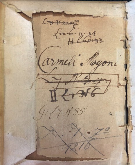 The same happens with the inner parts of this book, edited by the already mentioned Torsellino and once again about Francis Xavier, but this time with reference to his epistolary: Francisci Xaverii epistolarum libri quatuor (The four books of Francis Xavier’s letters [Mainz: Apud Lippium, 1600]). The book contains a sequence of call numbers testifying to the many times it was moved in the early modern period and in the more recent libraries that held it for some time. Both pictures show how the owners shelf marks changed from time to time.