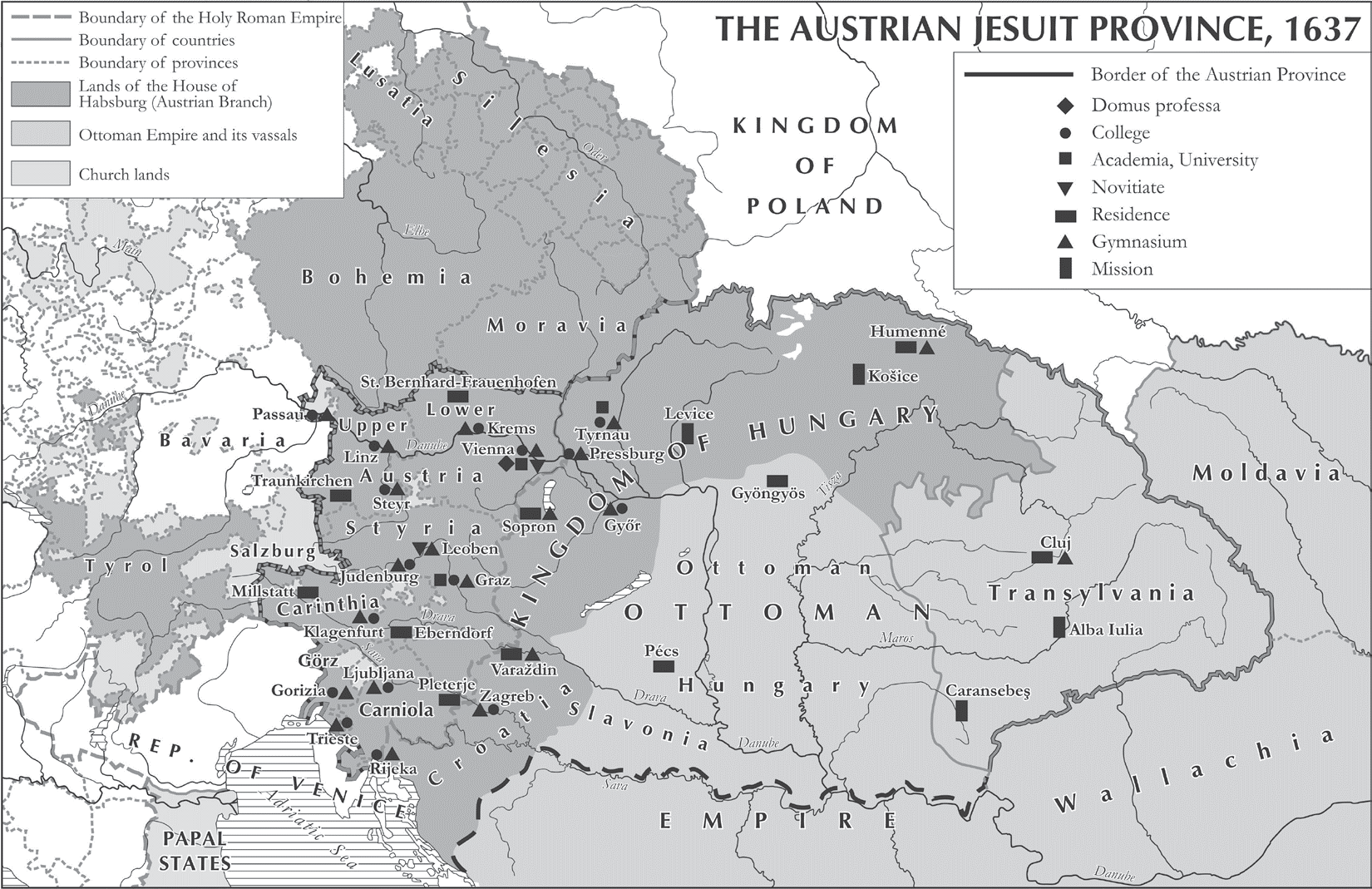 This is especially true in the former Austrian province (1563–1773), which, reflecting the interests of the Habsburg monarchs, included the Austrian hereditary provinces and the lands of the Hungarian crown.[5] (The lands of the Bohemian crown became an independent province in 1623.) The province’s extensive institutional expansion was also intertwined with the Counter-Reformation religious policy of Holy Roman Emperor Ferdinand II (r.1619–37), which was supported on the Hungarian side by the Jesuit preacher (concionator) and later archbishop Péter Pázmány (archbishop of Esztergom, primate of Hungary, 1616–37). The actual power of the monarch and the political situation and the structures of the church were fundamentally different in Hungary, where, since 1608, the Jesuits were forbidden by law from owning properties.[6] In addition, in the Kingdom of Hungary—split into three parts after 1540 by the Ottoman conquest (the Habsburg territories, the Principality of Transylvania as an Ottoman vassal state, and the central “conquered” area under direct Ottoman control)—the Catholics were just one of the tolerated denominations; in large areas, Protestant doctrines spread unhindered in the towns, among the nobility, and even in small villages. Therefore, some of the dioceses functioned in title only.[7] The Austrian hereditary provinces, however, were mainly under the spiritual authority of two powerful dioceses: the archdiocese of Salzburg and the bishopric of Passau.[8] Both of these diocesan seats were outside the hereditary provinces and thus outside the direct influence of the Habsburgs. As the province of Lower Austria was, with the exception of Vienna, entirely part of the bishopric of Passau, the archdukes kept the bishops under pressure for their own interests, to counterbalance Bavarian influence.[9] The Habsburgs, besides their Counter-Reformation purposes and based on their archducal jurisdiction, also abolished and reorganized old monasteries and friaries.[10] The process was accompanied by fiery disputes, the so-called “monastery controversy,” but the whole situation enabled Ferdinand II to treat the Jesuits so generously that after his death he was remembered as the “founder of the [Austrian] Jesuit province.”[11] The flattering title does not seem to be an exaggeration if we look at the state of the province in 1637: the number of colleges had doubled as compared to 1608, while the total number of Jesuits exceeded their number before 1623, when the Bohemian province was separated from the Austrian one.