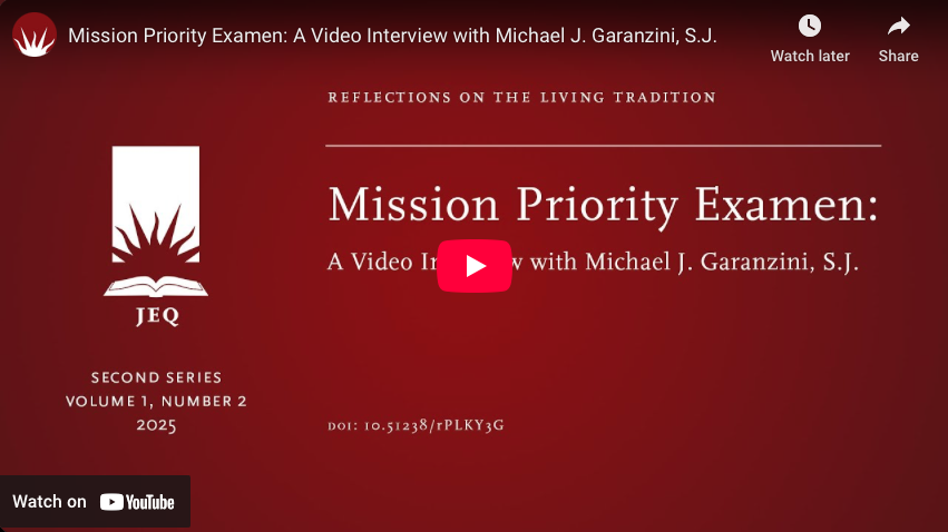 Beaumier, C. C., S.J., Garanzini, M. J., S.J., & Guterres, A. T. (2025). Mission Priority Examen: A video interview with Michael J. Garanzini, S.J. Jesuit Educational Quarterly, 1(2), 229. https://doi.org/10.51238/rPLKY3G